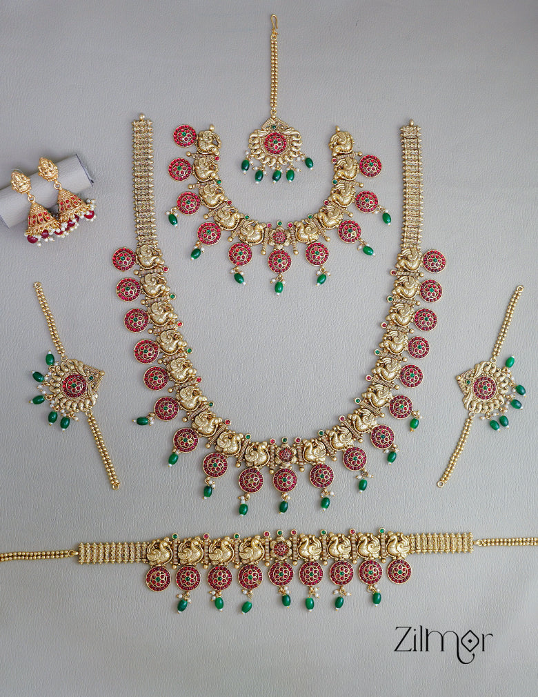 Bridal peacock stone combo set of haram, necklace and matching earrings and vanki, hip belt, maang tikka. Style it with a silk saree for a classic royal look. Delivery May takes 15 days.