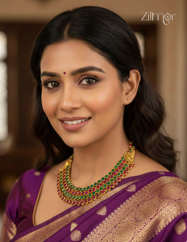 Multiple cascading layers add volume and grandeur, giving the necklace a majestic look ideal for wedding and festive attire.