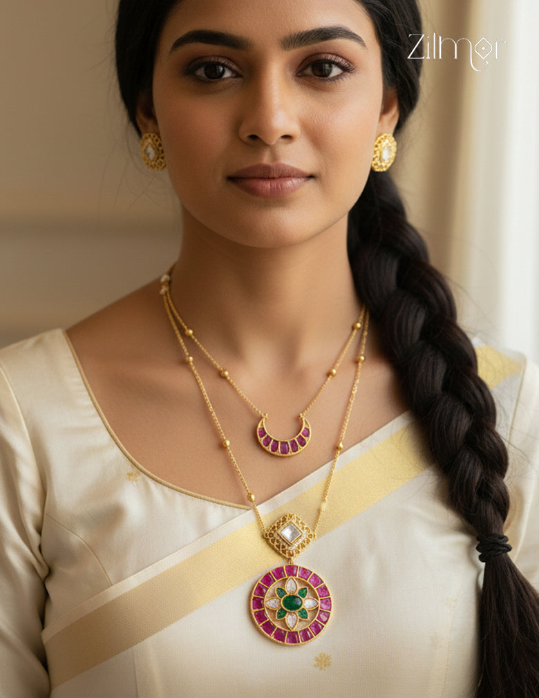 KH1011382 - Moissanite Stone& Jadau Kemp Double Layer Necklace with Earrings